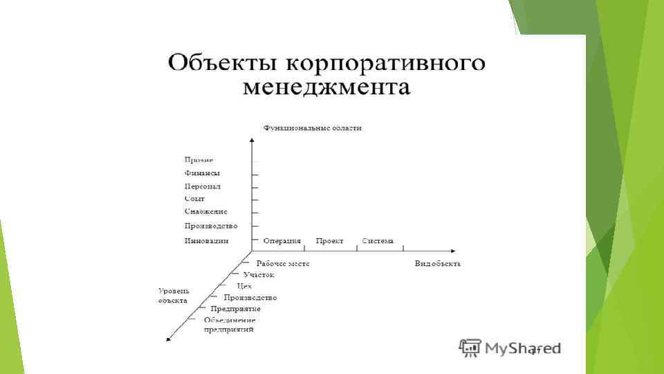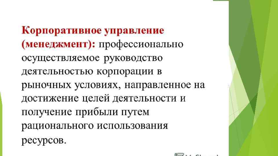 Корпоративный менеджмент – профессионально осуществляемое руководство деятельностью корпорации в рыночных условиях, направленное на достижение целей деятельности и получение прибыли путем рационального использования ресурсов. Субъект корпоративного менеджмента – профессионал управленец (менеджер) – лицо, выполняющее специфические управленческие функции, связанные с деятельностью корпорации. Объект корпоративного менеджмента – хозяйственная деятельность корпорации в целом или ее конкретная сфера (производство, сбыт, финансы и др. ), направленная на получение прибыли или предпринимательского дохода.
