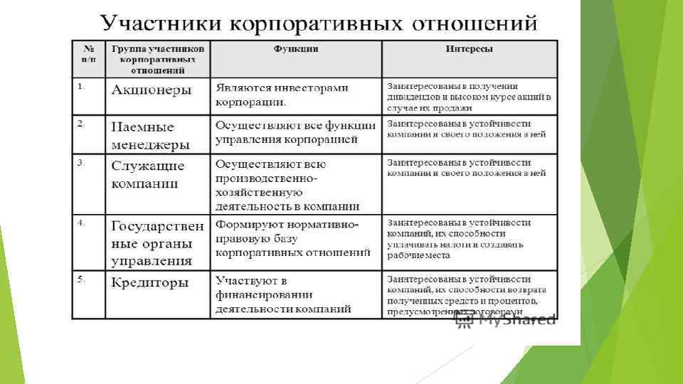 Участники корпоративных отношений СФОРМУЛИРУЕМ ОСНОВНЫЕ ВОПРОСЫ КОРПОРАТИВНОГО УПРАВЛЕНИЯ. 1. Если корпорацию составляют разные по типу группы акционеров (крупные и мелкие, держатели обычных и привилегированных акций), должны ли быть отдельно представлены и права этих групп? 2. Финансирование деятельности корпораций осуществляется как за счет внешнего долга, так и за счет акционерного капитала, что предполагает различия интересов кредиторов корпорации и владельцев акционерного капитала. В связи с этим: должны ли быть представлены в системе корпоративного управления обе эти категории? 3. Акционерный и заемный капитал представляют лишь один из типов инвестиций, а именно финансовый капитал. В то же время другие участники деятельности корпорации инвестируют другие формы капитала, например, работающие по найму сотрудники вкладывают "человеческий капитал".
