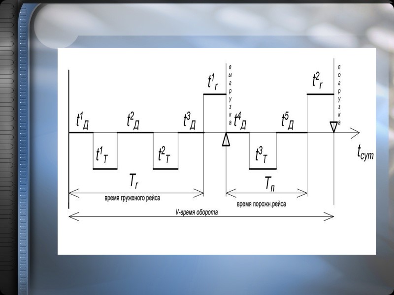 Основным качественным показателем использования вагонов является оборот – время полного цикла работы вагона от погрузки до следующей погрузки. Оборот складывается из трех составляющих: tд – время в движении; tт – время простоя для выполнения технических операций (на технических станциях); tг – время грузовых операций (погрузка и выгрузка). 97