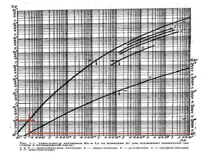 Пример 2. Определить минимальный размер частиц, осаждающихся в газоходе квадратного сечения длиной 16 м и высотой 2 м при линейной скорости газа 0, 5 м/с. Вязкость газа μс=0, 03 • 10 -3 Па • с, плотность газа ρс =0, 8 кг/м 3, плотность частиц ρч =4000 кг/м 3. Решение. Газ проходит канал в течение τ = 16/0, 5 = 32 с. За это время успеют полностью осесть только те частицы, действительная скорость осаждения которых не меньше, чем wос = 2/32 = 0, 062 м/с. Определим диаметр шарообразных частиц, теоретическая скорость осаждения которых вдвое больше, т. е. равна 0, 124 м/с. Вычислим значение критерия Лященко Ly по формуле: По графику (рис. 3. 1) находим значение Re = 0, 14, откуда