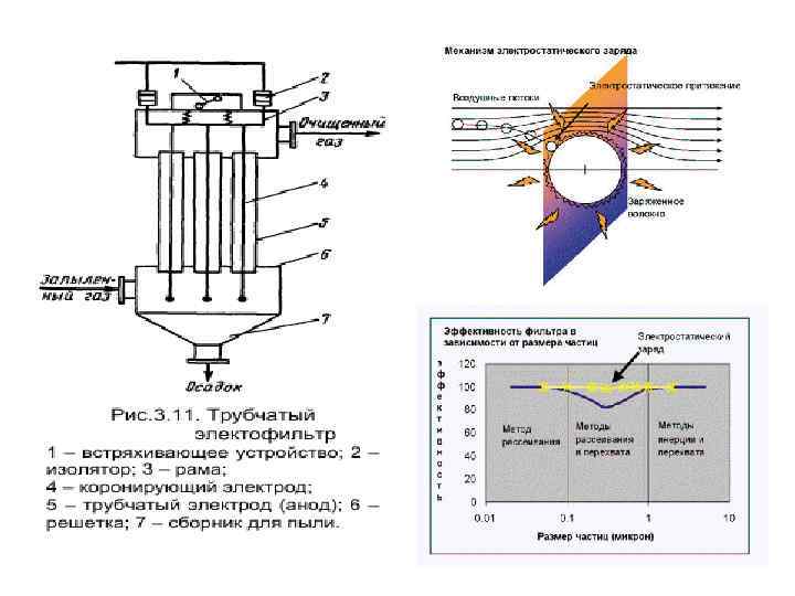 Электрофильтрация Электрическое осаждение. При ионизации молекул газов электрич. разрядом содержащиеся в газах частицы заряжаются, а затем осаждаются на электродах. Параметр осаждения за счёт действия электрич. сил характеризуется соотношением: где q-заряд ч-цы (Кл); E-напряж-сть электрич. поля коронного разряда (В/м). На этом методе осаждения частиц основана работа электрофильтров. Электрич. осаждение возможно и при взаимод. частиц с каплями (пузырями), причем электрич. заряды м. б. подведены к частицам, орошающей жидкости или, что наиб. эффективно, одновременно к частицам и жидкости. Электрич. осаждение происходит также при прохождении аэрозоля через фильтрующие перегородки; в этом случае заряды могут подводиться как к частицам, так и к фильтровальному материалу.