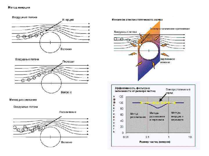 При приближении частицы к волокну действует несколько механизмов, которые могут привести к ее улавливанию: 1) касание; 2) инерционный захват; 3) диффузия; 4) электростатическое осаждение; 5) термофорез; 6) гравитационное осаждение; 7) ситовой эффект. Мелкие ч-цы могут обогнуть волокно и прилипнуть к его пов-сти в рез-те броуновского движения.