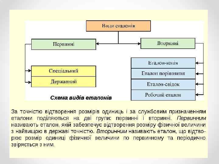 Еталон – технічний засіб, що забезпечує відтворення або зберігання одиниці з метою передачі інформації про її розміри засобам вимірювання, яке виконано за особливою специфікацією та офіційно затверджено в усталеному порядку як еталонне.