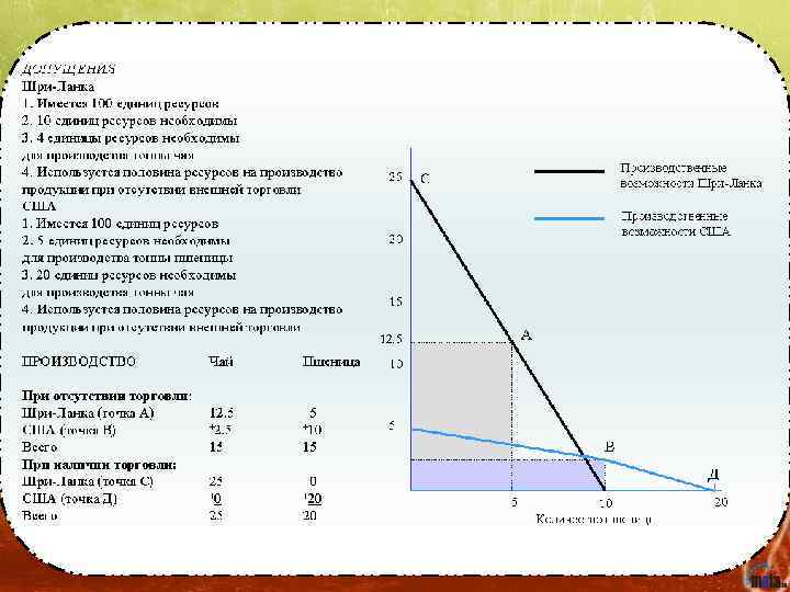 Условия существования модели • единственным фактором производства является труд; • имеет место полная занятость, то есть все имеющиеся в наличии трудовые ресурсы используются на производство товаров; • в международной торговле участвуют только две страны, которые торгуют друг с другом только двумя товарами; • издержки производства остаются постоянными, а их снижение увеличивает спрос на товар; • цена одного товара выражена в количестве труда, затраченного на производство другого; • транспортные расходы по перевозке товаров из одной страны в другую равны нулю; • внешняя торговля свободна от ограничений и регламентации