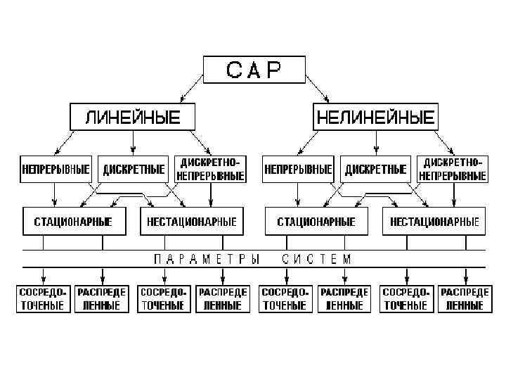 • По характеру используемой информации об условиях работы различают: • системы автоматического управления с жестким законом управления и структурой; • системы автоматического управления с изменяемыми структурой и законом управления, к которым относятся: – системы автоматической настройки; – самообучающие системы; – самоорганизующие системы. • По характеру математических соотношений различают: • линейные системы автоматического управления, для которых справедлив принцип суперпозиции;