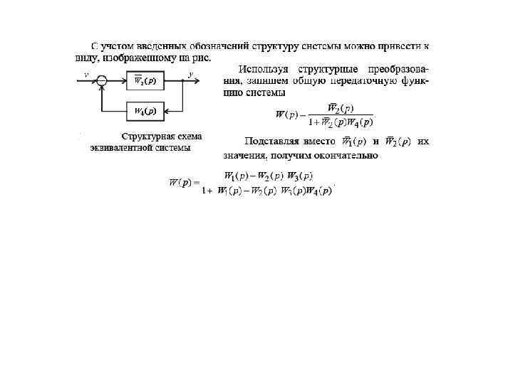 Правило переноса В некоторых случаях для получения общей передаточной функции системы с помощью структурных преобразований удобнее было бы перенести точку приложения сигнала через звено ближе к выходу или входу. При таком преобразовании структурной схемы следует придерживаться правила: передаточная функция системы должна оставаться неизменной. Рассмотрим ситуацию, когда точка приложения сигнала переносится через звено ближе к выходу. Исходная структура системы показана на рисунке. u W 1(p) W 3 (p) y W 2 (p) Определим для нее результирующую передаточную функцию (5. 1) Перенесем точку приложения сигнала через звено с передаточной функцией, добавив в этот канал некоторую передаточную функцию. Получим структурную схему преобразованной системы u W 1(p) W 3 (p) W 2 (p) y W 4 (p) Для нее передаточная функция имеет вид (5. 2)