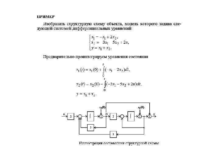 § 5. 3 Структурные схемы, соответствующие дифференциальным уравнениям Второй способ составления структурной схемы основан на использовании дифференциальных уравнений. Рассмотрим его сначала для объекта, поведение которого описывают векторноматричные уравнения Проинтегрируем уравнение состояния в по времени и определим переменные состояния и выхода: x(0) u B x A C y