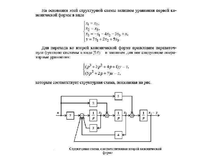 5. 4. 2 Вторая каноническая форма Рассмотрим второй способ перехода от передаточной функции (5. 4) к описанию в переменных состояния, для чего структуру системы (5. 6) схематично представим, как показано на рис. Ее операторные уравнения имеют вид (5. 9) Аналогично предыдущему случаю представим первое уравнение (5. 9) в виде цепочки из n интеграторов с обратными связями, а входное воздействие z 1 сформируем в соответствии со вторым уравнением (5. 9 ) в виде суммы управления u и m его производных (5. 9)