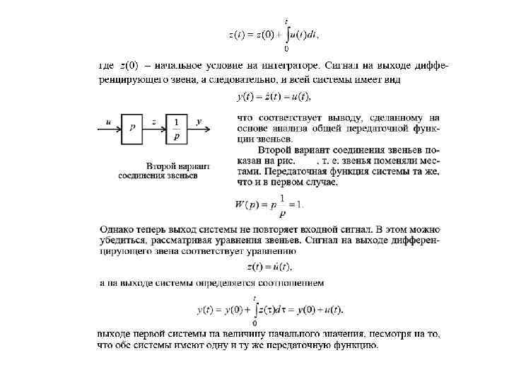 5. 5 Область применения структурного метода Структурный метод удобен при расчете линейных автоматических систем, но имеет свои ограничения. Метод предполагает использование передаточных функций, главным образом при нулевых начальных условиях. При использовании структурного метода необходимо придерживаться следующего правила: при любом преобразовании системы ее порядок не должен уменьшаться, т. е. недопустимо сокращение одинаковых множителей в числителе и знаменателе передаточной функции. Сокращая одинаковые множители, мы тем самым исключаем из модели системы реально существующие звенья. Тем не менее есть редкие ситуации, когда можно без ущерба для расчета сократить сомножители. На следующих примерах проиллюстрируем эти свойства.