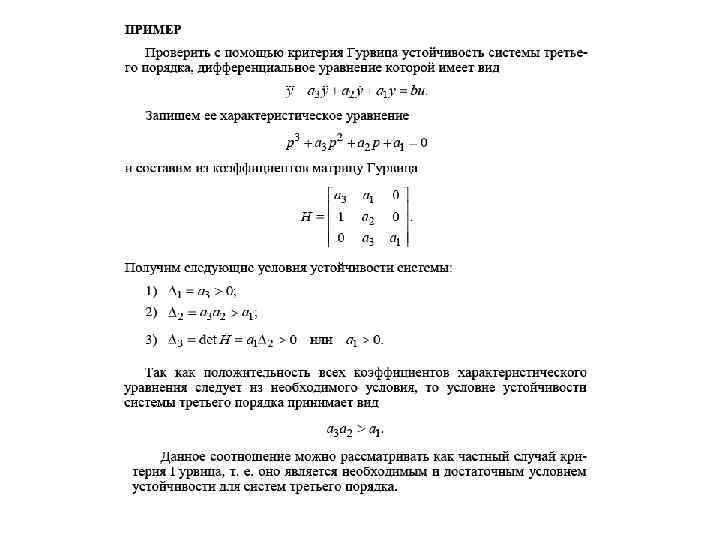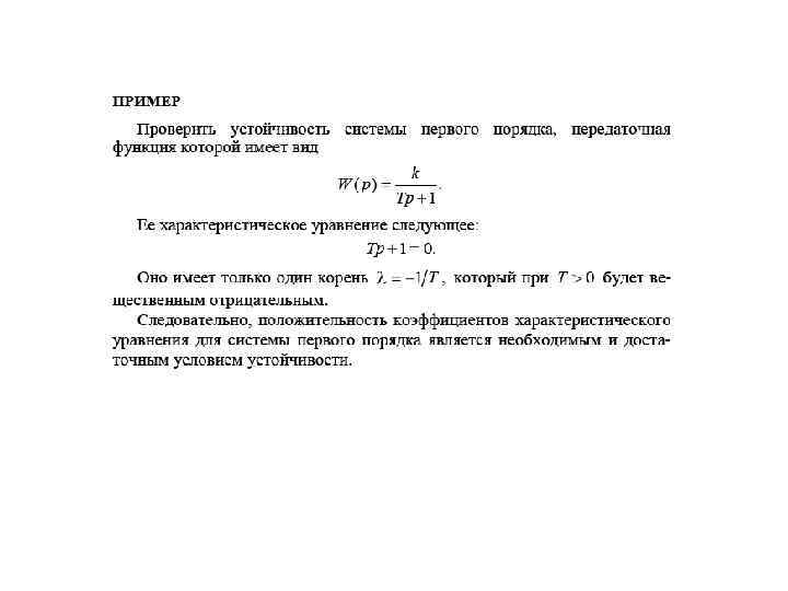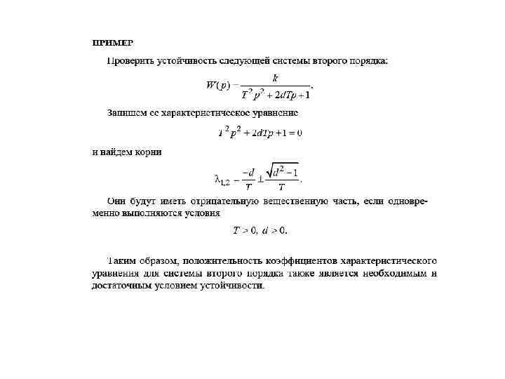 6. 2. 1. Общее условие устойчивости линейных систем Таким условием является положительность всех коэффициентов характеристического уравнения (6. 11). В этом можно убедиться, если при известных корнях i представить характеристический полином A(p) в виде произведения В случае, когда все корни вещественные уравнение принимает вид: характеристическое Раскрывая скобки, получим уравнение типа (6. 11), где все коэффициенты будут положительными. Нетрудно убедиться в том, что аналогичный результат получиться, если корни i комплексно-сопряженные с отрицательной вещественной частью. Таким образом, коэффициенты характеристического уравнения (6. 11) устойчивой системы всегда будут положительны. При наличии хотя бы одного отрицательного коэффициента система будет неустойчивой. Дополнительных исследований не требуется. Однако положительность всех коэффициентов еще не гарантирует устойчивости системы, необходима ее дополнительная проверка.