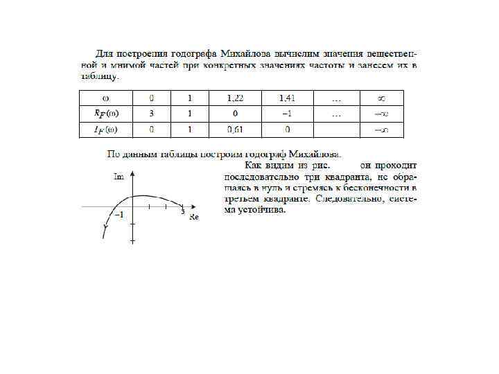 6. 3. 2 Критерий Михайлова Критерий сформулирован математиком А. В. Михайловым в 1938 г. Он базируется на принципе аргумента теории функций комплексной переменной. Для анализа устойчивости системы предлагается исследовать характеристический комплекс F(j ), который получается из характеристического полинома: заменой p на j (6. 17) (6. 18) Выделим в (6. 14) вещественную и мнимую части, а также модуль и фазу: (6. 19) При конкретном численном значении частоты ( = 1) характеристический комплекс (6. 19) представляет собой комплексное число которое можно изобразить на плоскости в виде вектора, соединяющего начало координат с точкой. При изменении от 0 до ∞ конец вектора F(j )выписывает на комплексной плоскости некоторую кривую, которую называют годографом Михайлова (см. рис. ). Причем начинается годограф, как следует из соотношения (6. 18), в точке с координатами.