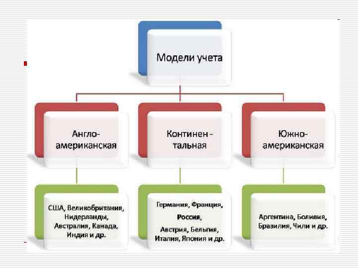 Южно-американская (латиноамериканская) модель – отличие этой модели в том, что она четко сориентирована на нужды государства, прежде всего налоговые. Для стран этой модели характерна большая унифицированность и меньшая сложность отчетности. Также для них характерны развитые механизмы учета инфляции. К этой модели, как видно из названия, относятся прежде всего страны Латинской Америки. Вновь нарождающиеся модели. Исламская модель -находясь под огромным влиянием богословских идей, она имеет ряд особенностей, в частности запрещается получение финансовых дивидендов ради собственно дивидендов. Рыночным ценам отдается предпочтение при оценке активов и обязательств компаний. Считается, что эта модель еще не достигла того уровня развития, который присущ финансовому учету вышеописанных моделей. Интернациональная модель. Она вытекает из потребности в международной согласованности учета, прежде всего в интересах МНК (Мультинациональных корпораций) и иностранных участников международных валютных рынков.