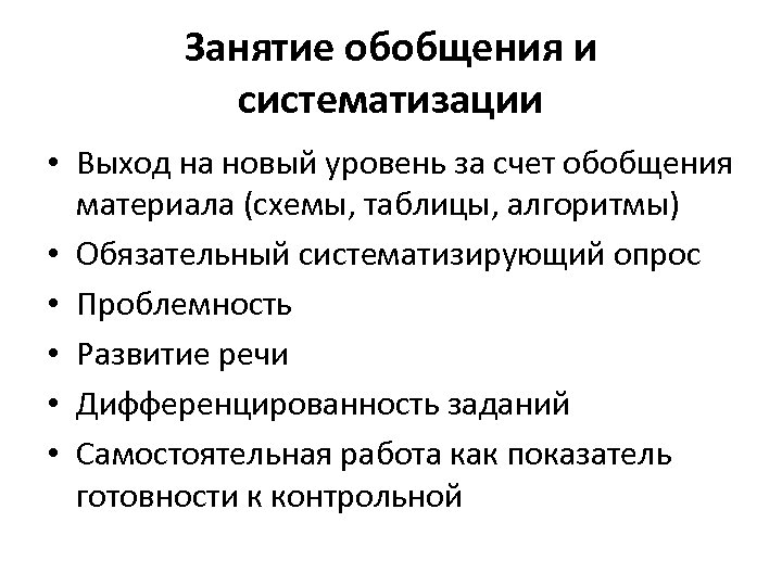 Занятие обобщения и систематизации • Выход на новый уровень за счет обобщения материала (схемы, таблицы, алгоритмы) • Обязательный систематизирующий опрос • Проблемность • Развитие речи • Дифференцированность заданий • Самостоятельная работа как показатель готовности к контрольной