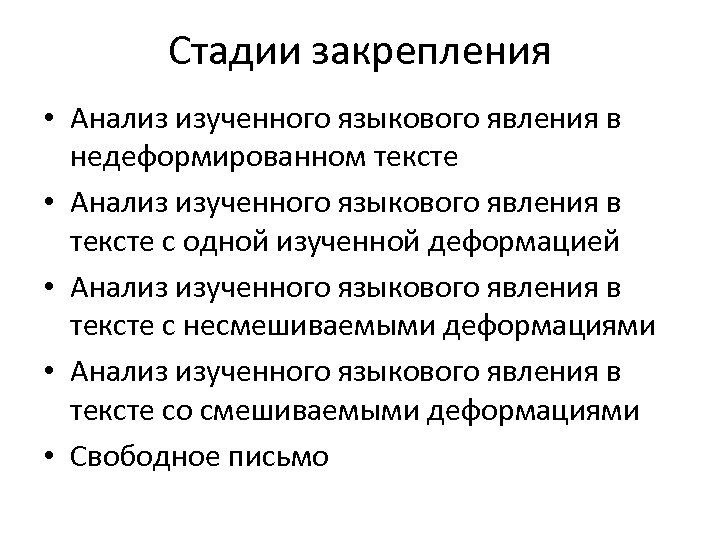 Стадии закрепления • Анализ изученного языкового явления в недеформированном тексте • Анализ изученного языкового явления в тексте с одной изученной деформацией • Анализ изученного языкового явления в тексте с несмешиваемыми деформациями • Анализ изученного языкового явления в тексте со смешиваемыми деформациями • Свободное письмо