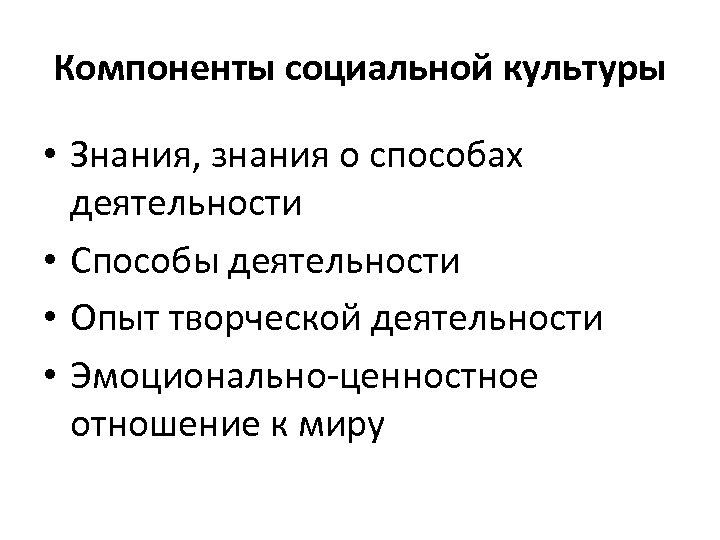 Компоненты социальной культуры • Знания, знания о способах деятельности • Способы деятельности • Опыт творческой деятельности • Эмоционально-ценностное отношение к миру
