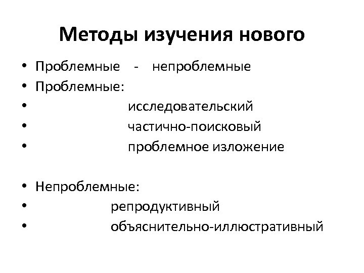 Методы изучения нового • Проблемные - непроблемные • Проблемные: • исследовательский • частично-поисковый • проблемное изложение • Непроблемные: • репродуктивный • объяснительно-иллюстративный