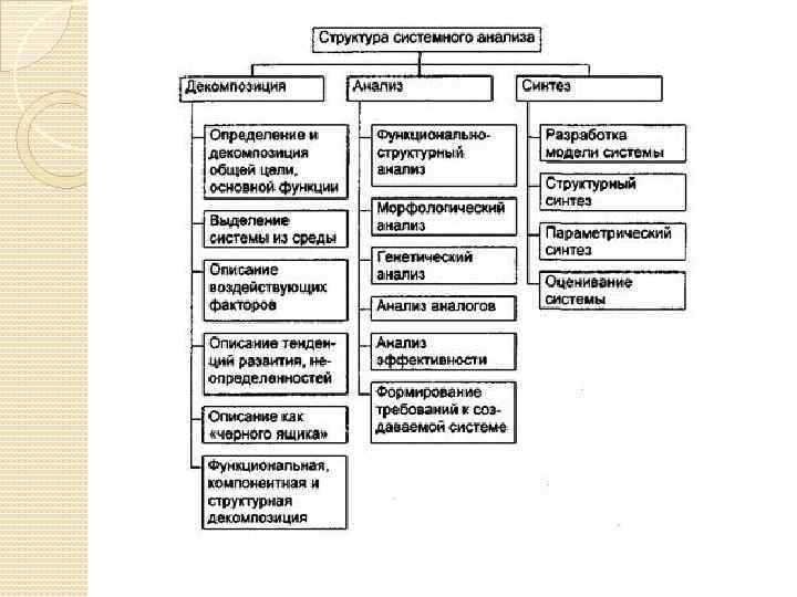 Декомпозиция Основной операцией анализа является разделение целого на части. Задача распадается на подзадачи, система — на подсистемы, цели — на подцели и т. д. При необходимости этот процесс повторяется, что приводит к иерархическим древовидным структурам.