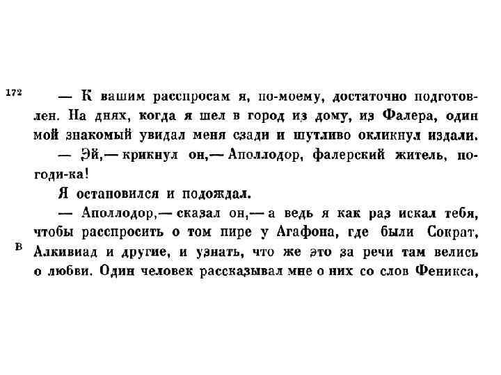 Платон-филолог: Федр 236 е Phaedrus <… >I take my solemn oath that unless you produce the discourse in the very presence of this plane tree, I will never read you another or tell you of another. Socrates Oh! You wretch! How well you found out how to make a lover of discourse do your will! βαβαῖ, ὦ μιαρέ, ὡς εὖ ἀνηῦρες τὴν ἀνάγκην ἀνδρὶ φιλολόγῳ ποιεῖν ὃ ἂν κελεύῃς. Phaedrus Then why do you try to get out of it? Socrates I won't any more, since you have taken this oath; for how could I give up such pleasures?
