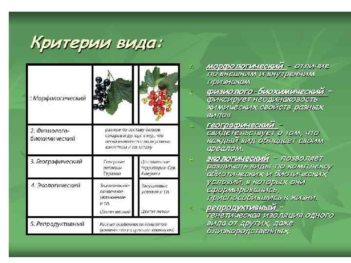 КРИТЕРИИ ВИДА 1. МОРФОЛОГИЧЕСКИЙ 2. ЦИТОГЕНЕТИЧЕСКИЙ 3. ФИЗИОЛОГО – БИОХИМИЧЕСКИЙ 4. ЭКОЛОГИЧЕНСКИЙ 5. ГЕОГРАФИЧЕСКИЙ