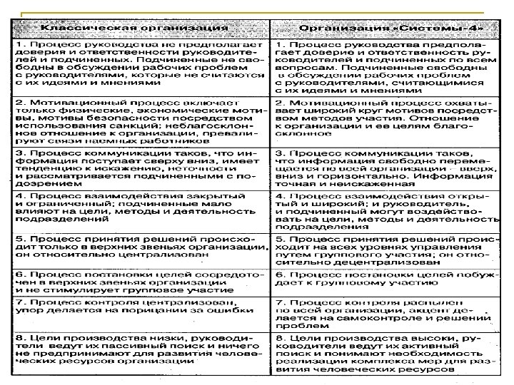 Ситуационные теории: теория эффективной организации Организации, построенные на основе положений классической теории, являются неэффективными, так как они склонны к консерватизму и не учитывают изменяющийся характер внешней среды (Р. Лайкерт). Было также доказано, что организации можно описывать с помощью определенных измерений, каждое из которых показывает соотношение характеристик по классической теории организации и по «Системе-4»