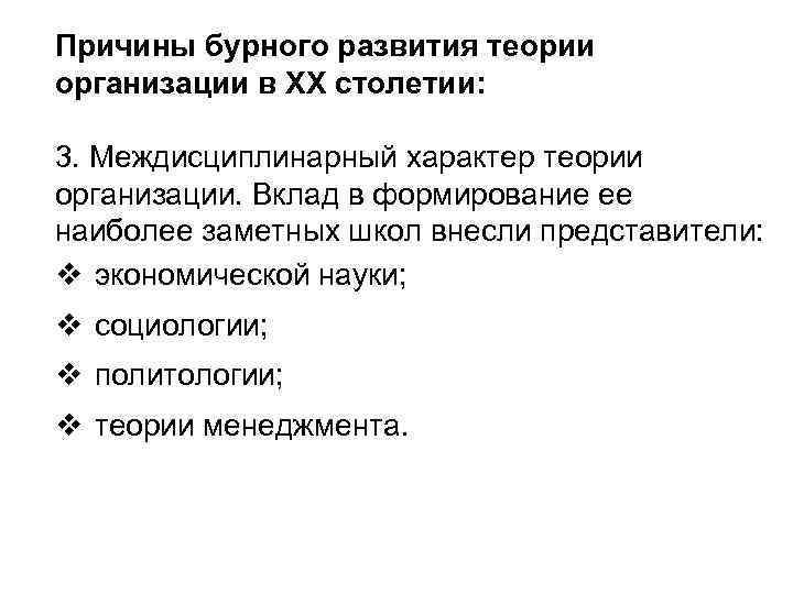 Причины бурного развития теории организации в ХХ столетии: 3. Междисциплинарный характер теории организации. Вклад в формирование ее наиболее заметных школ внесли представители: v экономической науки; v социологии; v политологии; v теории менеджмента.