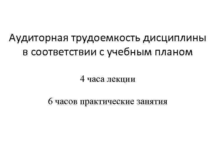Аудиторная трудоемкость дисциплины в соответствии с учебным планом 4 часа лекции 6 часов практические занятия