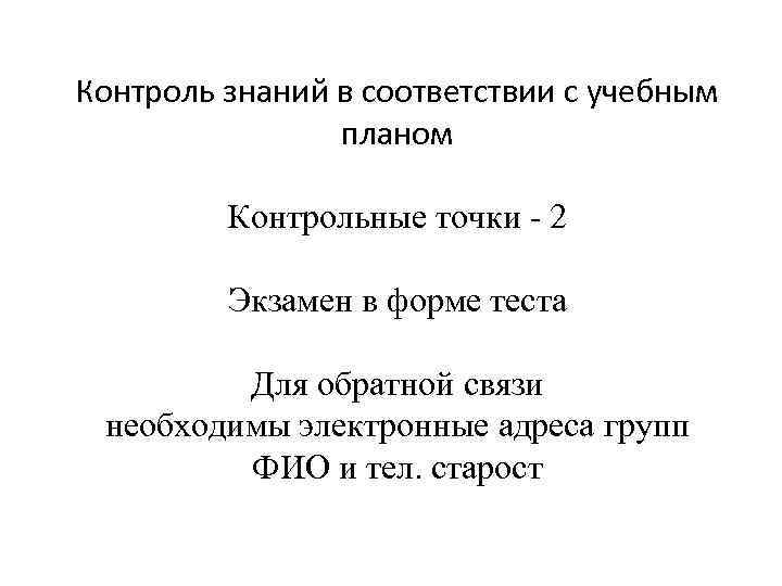 Контроль знаний в соответствии с учебным планом Контрольные точки - 2 Экзамен в форме теста Для обратной связи необходимы электронные адреса групп ФИО и тел. старост