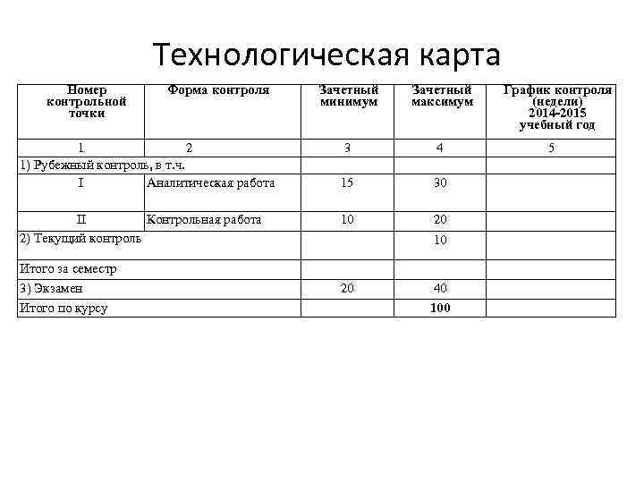 Технологическая карта Номер контрольной точки Форма контроля 1 2 1) Рубежный контроль, в т. ч. I Аналитическая работа II Контрольная работа 2) Текущий контроль Итого за семестр 3) Экзамен Итого по курсу Зачетный минимум Зачетный максимум 3 4 15 30 10 20 40 100 График контроля (недели) 2014 -2015 учебный год 5