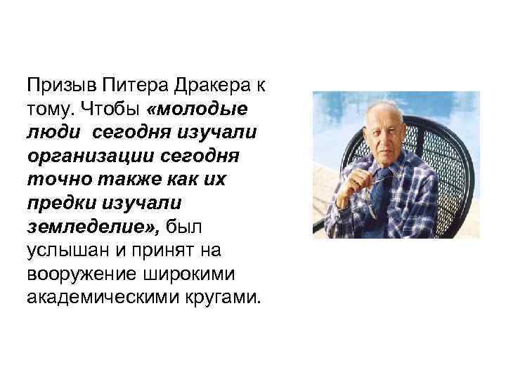 Призыв Питера Дракера к тому. Чтобы «молодые люди сегодня изучали организации сегодня точно также как их предки изучали земледелие» , был услышан и принят на вооружение широкими академическими кругами.