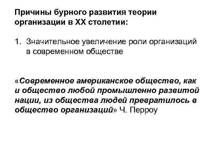 Причины бурного развития теории организации в ХХ столетии: 1. Значительное увеличение роли организаций в современном обществе «Современное американское общество, как и общество любой промышленно развитой нации, из общества людей превратилось в общество организаций» Ч. Перроу