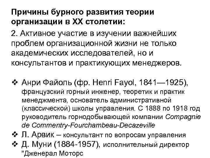 Причины бурного развития теории организации в ХХ столетии: 2. Активное участие в изучении важнейших проблем организационной жизни не только академических исследователей, но и консультантов и практикующих менеджеров. v Анри Файоль (фр. Henri Fayol, 1841— 1925), французский горный инженер, теоретик и практик менеджмента, основатель административной (классической) школы управления. С 1888 по 1918 год руководитель горнодобывающей компании Compagnie de Commentry-Fourchambeau-Decazeville v Л. Арвик – консультант по вопросам управления v Д. Муни (1884 -1957), исполнительный директор "Дженерал Моторс