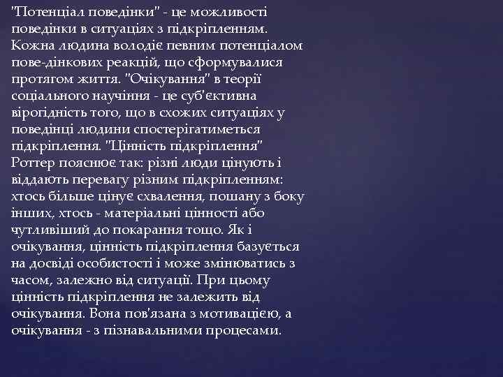 "Потенціал поведінки" - це можливості поведінки в ситуаціях з підкріпленням. Кожна людина володіє певним потенціалом пове-дінкових реакцій, що сформувалися протягом життя. "Очікування" в теорії соціального научіння - це суб'єктивна вірогідність того, що в схожих ситуаціях у поведінці людини спостерігатиметься підкріплення. "Цінність підкріплення" Роттер пояснює так: різні люди цінують і віддають перевагу різним підкріпленням: хтось більше цінує схвалення, пошану з боку інших, хтось - матеріальні цінності або чутливіший до покарання тощо. Як і очікування, цінність підкріплення базується на досвіді особистості і може змінюватись з часом, залежно від ситуації. При цьому цінність підкріплення не залежить від очікування. Вона пов'язана з мотивацією, а очікування - з пізнавальними процесами.