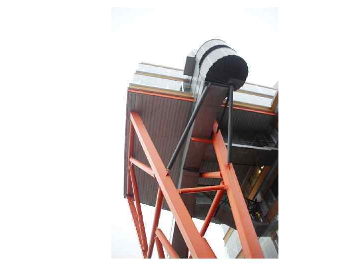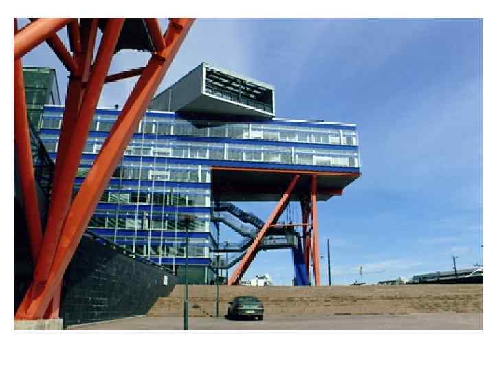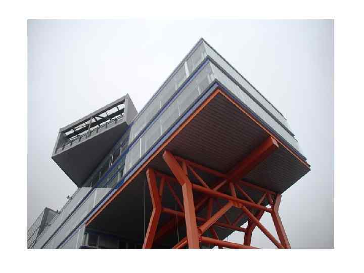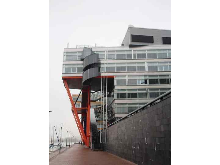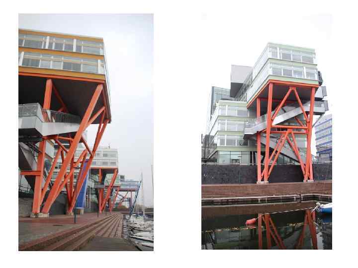 Оранжевого цвета стойки и дугообразные линии вызывают в памяти творчество Якова Чернихова: