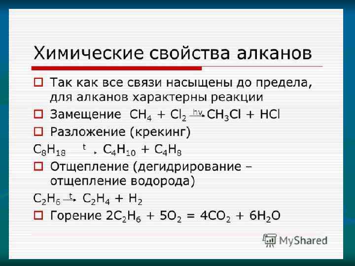 Реакции отщепления (элиминирования) – это реакции, в ходе которых из одной молекулы исходного вещества образуется несколько новых веществ 1. Реакции дегидрирования CH 3 -CH 3 → (отщепления водорода) CH 2 ═ CH 2 + H 2 2. Реакции дегалогенирования (отщепления галогена) CH 2 Сl ─ CH 3 + Zn → CH 2 ═ CH ─ CH 3 + Zn. Cl 2 3. Реакции дегидрогалогенирования (отщепления галогеноводорода) CH 3 ─ CH 2 Сl + Na. OH → CH 2 ═ CH 2 + Na. Cl + H 2 O 4. Реакции дегидратации (отщепление воды) CH 3 ─ CH 2 OH → CH 3 ─ CH 2 ═ CH 2 + HOH