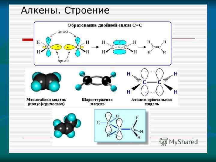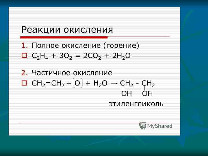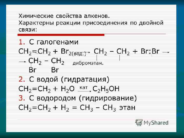 Реакции присоединения – это реакции, в ходе которых молекулы реагирующих веществ соединяются в одну 1. Реакции гидрирования (присоединения водорода) CH 2 ═ CH 2 + H 2 → CH 3 -CH 3 2. Реакции галогенирования (присоединения галогена) CH 2 ═ CH ─ CH 3 + Сl 2 → CH 2 Сl ─ CH 3 3. Реакции гидрогалогенирования (присоединения галогеноводорода) CH 2 ═ CH ─ CH 3 + HСl → CH 3─ CHСl ─ CH 3 4. Реакции гидратации (присоединение воды) CH 2 ═ CH 2 + HOH → CH 3 ─ CH 2 OH