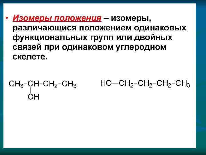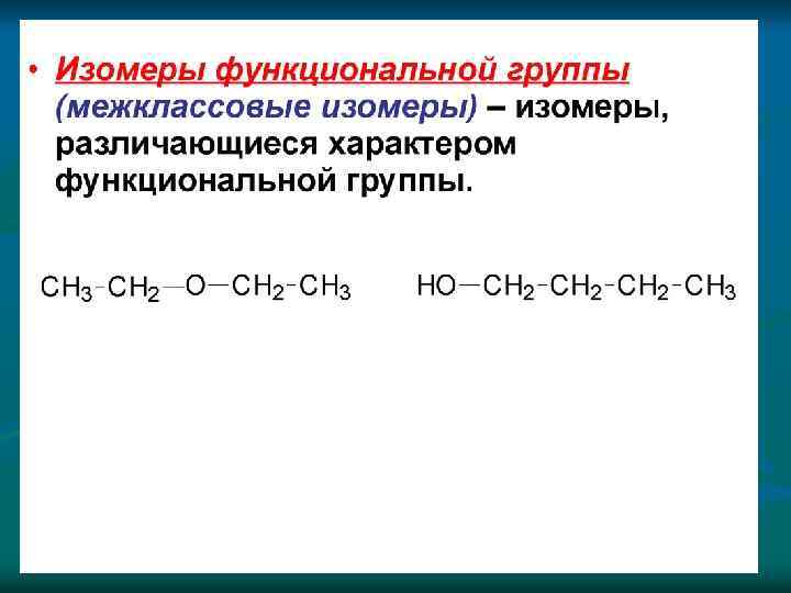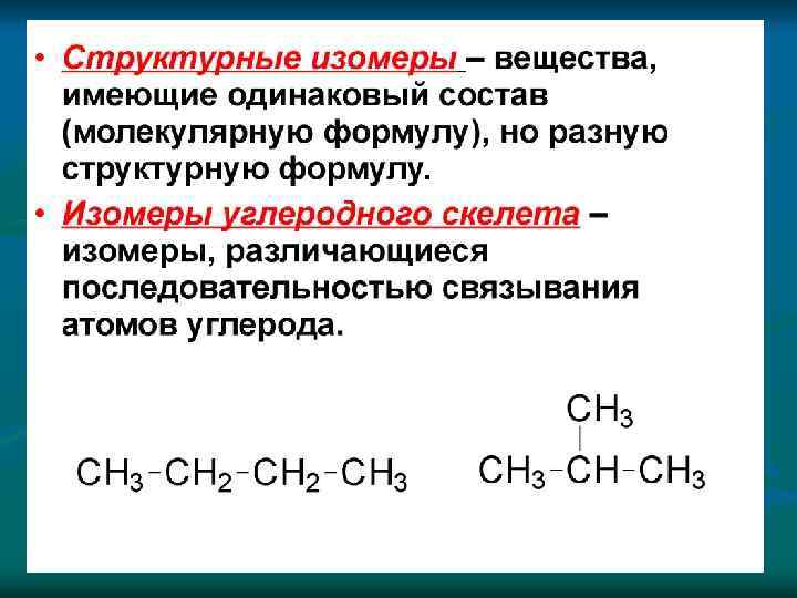 Структурная изомерия n Структурная изомерия, при которой вещества различаются порядком связи атомов в молекулах: 1) изомерия углеродного скелета Н - Бутан изобутан (2 -метилпропан) 2) изомерия положения а) кратных связей: бутен-1 б) заместителей 1 -хлорпропан в) изомерия положения функциональных групп 3) изомерия гомологических рядов (межклассовая) бутен-2 2 -хлорпропан