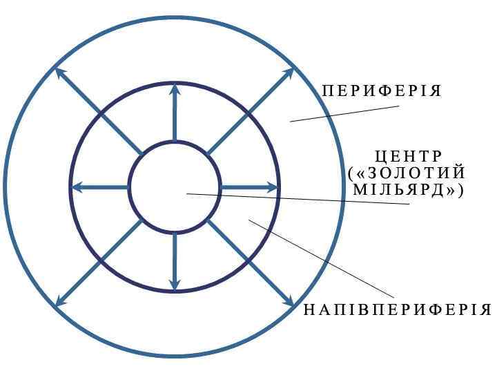 • Центр світ-економіки завжди є космополітичним: економіка пов'язує регіони з різними культурами. Метрополія – це такий собі «Ноїв ковчег» • Через таку строкатість центр вимушений дозволяти хоч частково політичні і релігійні свободи, які неможливі в інших зонах. • Для центрів характерна дорожнеча і соціальне розшарування • Простір світ-економіки ділиться на певні структурні зони: вузький центр, другорядні області, великі периферійні території. • Периферію характеризує архаїчність, відсталість, легка доступність до експлуатації іншими.