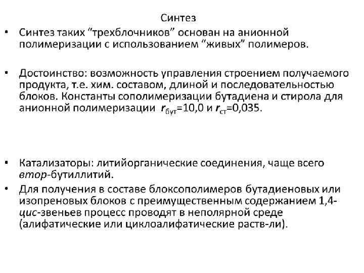 Условия синтеза • Применяют литийорганический катализатор ( как правило – втор -бутиллитий), позволяющий получать сополимеры с узким ММР. • Полимеризацию необходимо проводить в неполярном р-ле. Поскольку ароматические углеводороды участвуют в р-циях переноса кинетич. цепей, то предпочтительным является использование алифатических или циклоалифатических р-лей (чаще всего смесь гексан-циклогексан). • Второй вариант, принятый в промышленности, в периодической последовательной полимеризации стирола, бутадиена и снова стирола. На каждой из стадий мономер полностью исчерпывается. Если на первой стадии температура составляет 40 -450 С, то на второй и третьей она равна 50 -600 С и 70 -800 С соотв. Продолжительность первой и третьей стадий – около 1 ч, второй стадии – около 5 ч. На третьей стадии вместо стирола можно использовать α-метилстирол, но тогда в систему вводят полярные добавки, т. к. этот мономер полимеризуется менее активно. • Дезактивацию катализатора проводят стабилизатором, например агидолом-1, вводимым в виде р-ра. [1]