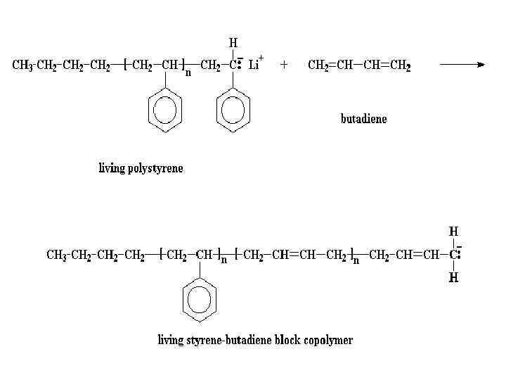 • Образовавшийся при полном исчерпании мономера полистириллитий сохраняет активность, и если в это время в систему ввести бутадиен или изопрен, полимеризация продолжается с формированием полибутадиенового блока: [1]