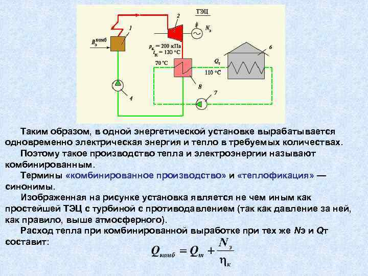 Таким образом, в одной энергетической установке вырабатывается одновременно электрическая энергия и тепло в требуемых количествах. Поэтому такое производство тепла и электроэнергии называют комбинированным. Термины «комбинированное производство» и «теплофикация» — синонимы. Изображенная на рисунке установка является не чем иным как простейшей ТЭЦ с турбиной с противодавлением (так как давление за ней, как правило, выше атмосферного). Расход тепла при комбинированной выработке при тех же Nэ и Qт составит: