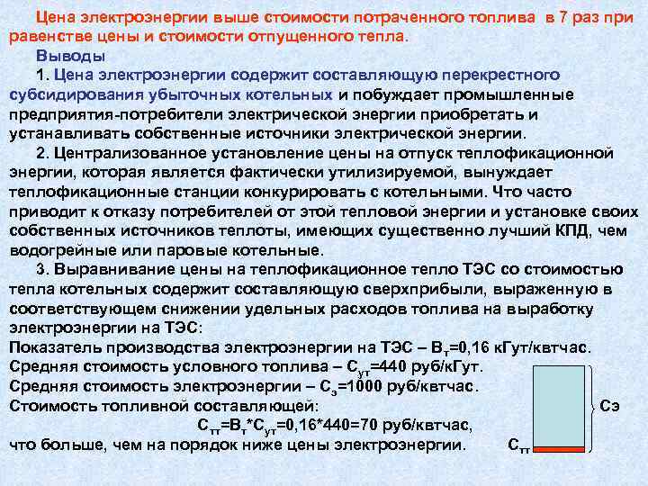 Цена электроэнергии выше стоимости потраченного топлива в 7 раз при равенстве цены и стоимости отпущенного тепла. Выводы 1. Цена электроэнергии содержит составляющую перекрестного субсидирования убыточных котельных и побуждает промышленные предприятия потребители электрической энергии приобретать и устанавливать собственные источники электрической энергии. 2. Централизованное установление цены на отпуск теплофикационной энергии, которая является фактически утилизируемой, вынуждает теплофикационные станции конкурировать с котельными. Что часто приводит к отказу потребителей от этой тепловой энергии и установке своих собственных источников теплоты, имеющих существенно лучший КПД, чем водогрейные или паровые котельные. 3. Выравнивание цены на теплофикационное тепло ТЭС со стоимостью тепла котельных содержит составляющую сверхприбыли, выраженную в соответствующем снижении удельных расходов топлива на выработку электроэнергии на ТЭС: Показатель производства электроэнергии на ТЭС – Вт=0, 16 к. Гут/квтчас. Средняя стоимость условного топлива – Сут=440 руб/к. Гут. Средняя стоимость электроэнергии – Сэ=1000 руб/квтчас. Стоимость топливной составляющей: Сэ С тт=Вт*Сут=0, 16*440=70 руб/квтчас, что больше, чем на порядок ниже цены электроэнергии. Стт