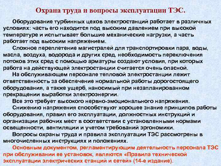 Охрана труда и вопросы эксплуатации ТЭС. Оборудование турбинных цехов электростанций работает в различных условиях: часть его находится под высоким давлением при высокой температуре и испытывает большие механические нагрузки, а часть работает под высоким напряжением. Сложное переплетение магистралей для транспортировки пара, воды, масла, воздуха, водорода и других сред, необходимость переключения потоков этих сред с помощью арматуры создают условия, при которых работа на действующей электростанции считается очень опасной. На обслуживающем персонале тепловой электростанции лежит ответственность за обеспечение нормальной работы дорогостоящего оборудования, а также ущерб, наносимый при незапланированном прекращении выработки электроэнергии. Все это требует высокого нервно эмоционального напряжения. Снижению напряжения способствуют хорошее знание принципов работы оборудования, правил его эксплуатации, должностных инструкций и организации рабочих мест в соответствии с установленными нормами освещенности, вентиляции и учетом требований эргономики. Вопросы охраны труда и правила эксплуатации ТЭС рассмотрены в многочисленных инструкциях и положениях. Основным документом, регламентирующим деятельность персонала ТЭС при обслуживании ее установок, являются «Правила технической эксплуатации электрических станций и сетей» (14 е издание).