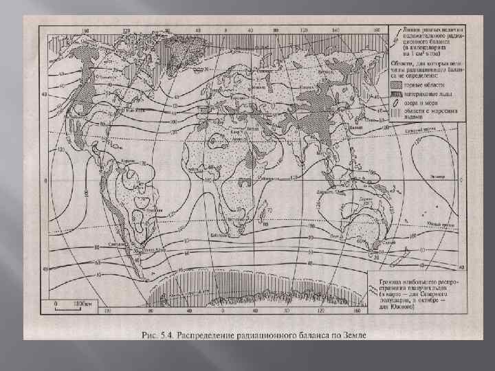 ГЕОГРАФИЧЕСКОЕ РАСПРЕДЕЛЕНИЕ РАДИАЦИОННОГО БАЛАНСА Радиационный баланс земной поверхности за год положительный повсюду на Земле, кроме ледяных плато Гренландии и Антарктиды. На океанах радиационный баланс больше, чем на суше в тех же широтах. Это объясняется тем, что радиация в океанах поглощается большим слоем, чем на суше, а эффективное излучение не такое большое вследствие более низкой температуры морской поверхности, чем поверхности суши.