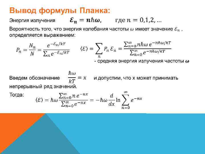 СВЯЗЬ ФОРМУЛЫ ПЛАНКА С КЛАССИЧЕСКИМИ ЗАКОНАМИ ТЕПЛОВОГО ИЗЛУЧЕНИЯ: , 1) При (область малых частот) формула Планка переходит в формулу Рэлея-Джинса 2) При , (область высоких частот) формула Планка переходит в формулу Вина