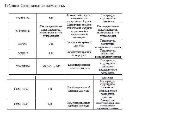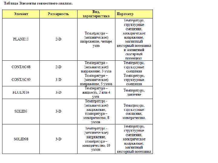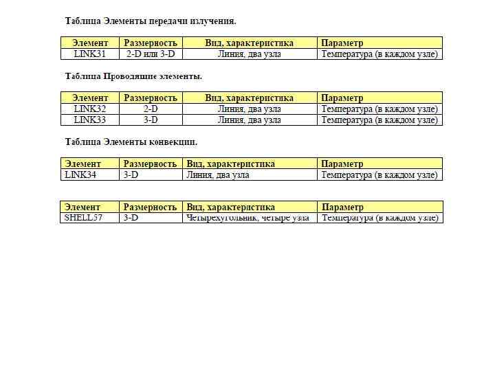 Доступные для теплового анализа элементы ANSYS содержит 40 элементов с помощью которых Вы можете провести стационарный тепловой расчет. Все из нижеприведенных элементов поддерживают как стационарный, так и нестационарный анализ.