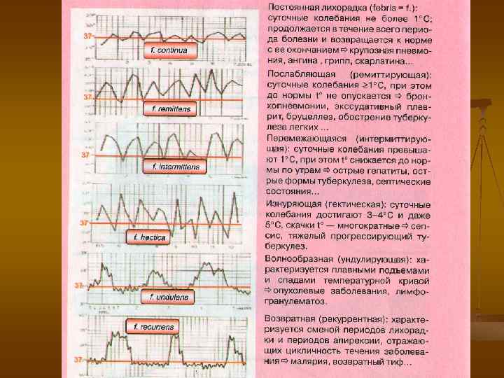 По степени повышения температуры тела различают: субфебрильную (от 37 до 38 градусов C) n умеренную (от 38 до 39 градусов по C) n высокую (от 39 до 41 градусов по C) n чрезмерную (выше 41 градусов по C). n