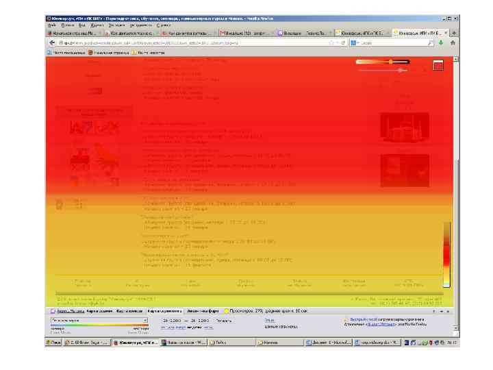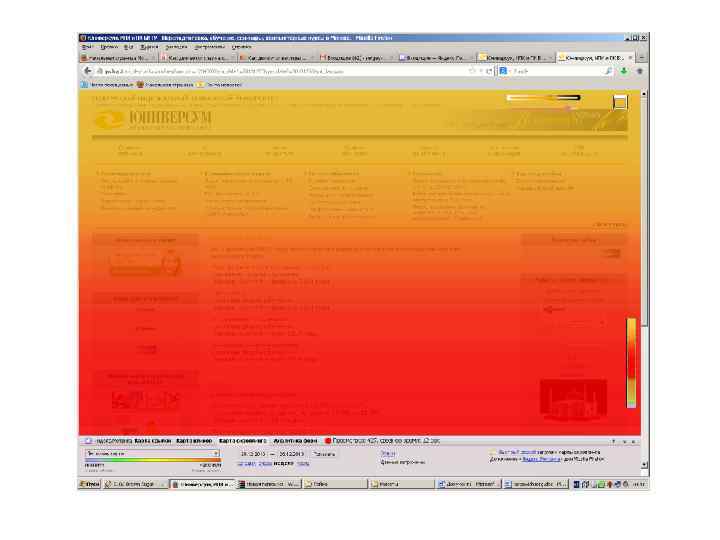 Тепловые карты, полученные при исследованиях направлений движения взглядов пользователей, посещавших страницы трех web-сайтов статья в разделе "о нас" на сайте компании страница с описанием продукта на сайте электронной коммерции результат выполнения поискового запроса в браузере Те области, на которых взгляд задерживался дольше, изображены на рисунке красным цветом; желтый цвет означает меньшую продолжительность взгляда, и, наконец, на области, изображенные синим цветом, пользователи почти не смотрели, а на области, отмеченные серым, не смотрели вовсе