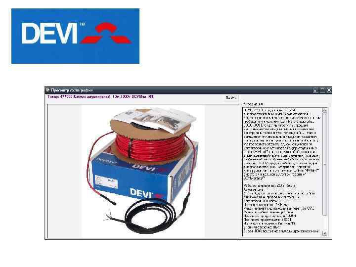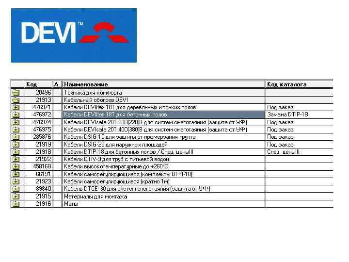 DPH− 10. Двухжильный, экранированный, саморегулирующиеся. Для защиты от обледенения металлических и пластиковых труб, желобов на крышах и водосточных труб, поддержания заданной температуры жидкости в трубе. Возможна установка внутри труб. Нагревательные маты devimat™: DТIF. Двухжильный, диаметром 3 мм, с двойной фторопластовой изоляцией и сплошным алюминиевым экраном, закрепленный на самоклеющейся сетке шириной 45 см. Для установки в пол ( «комфортный пол» ) без формирования толстой цементной стяжки (в основном под плитку с плиточным клеем).