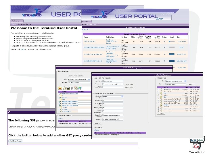Tera. Grid User Portal Vision • Integrate important user capabilities in one place: – Information services: • Documentation, training, real time consulting • Notification (news, MOTDs, next downtimes, etc. ) • Resources info, calendars, cross -site run scheduling • Network info – Account services • Allocation requests • Allocation management & usage reporting • Accounts management (including setting up grid credentials) – Interactive services • Job launching • File transfers • Linear workflow • Data mining – Listing of and access to data collections – Remote vis (interactive), and eventually collaborative • With personalizability and customizability, it can be a foundation for application portals and (some) science gateways