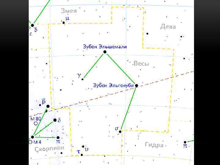 ТЕРЕЗИ • Терези (лат. Libra) — зодіакальне сузір'я, що лежить між сузір'ями Скорпіона і Діви. Неозброєним оком в ньому можна виділити 83 зорі. Солнце знаходиться у сузір'ї Терезів з 31 жовтня по 22 листопада • Спостерігається у широтах між +61° i − 90° • Ввечері найкраще спостерігати протягом квітня, травня. • Вечірня (21: 00) кульмінація